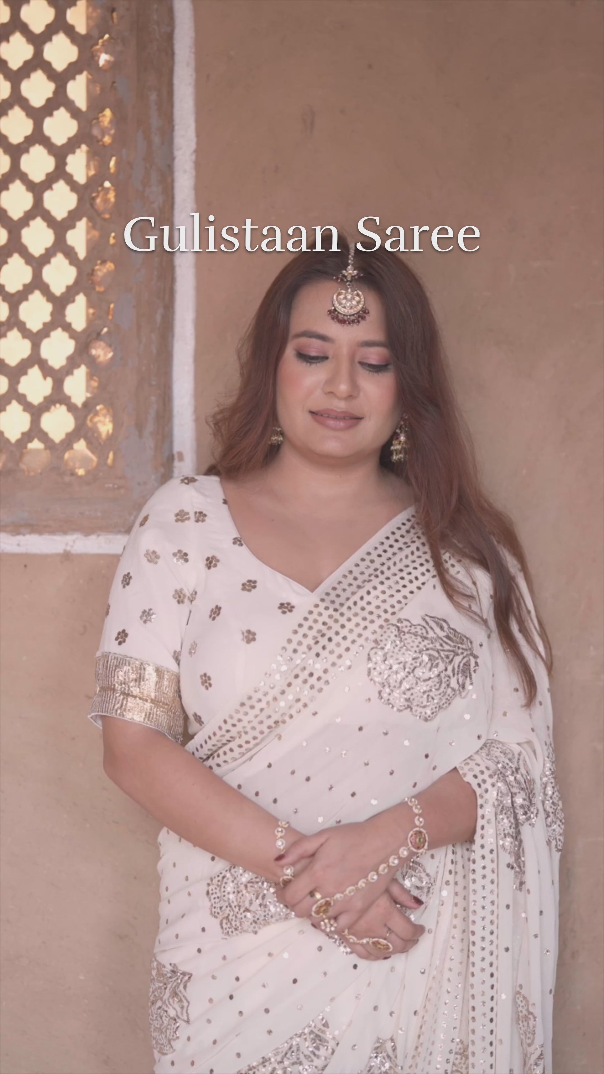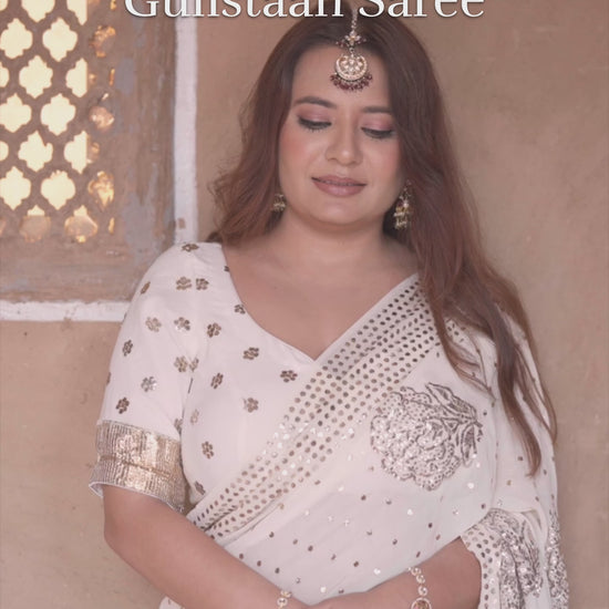 Crafted in feather-light georgette, the Gulistaan Saree features scattered kaamdaani gulaab bootas and a delicately hand-worked mukaish tikki border. A refined expression of heritage, designed for understated elegance.